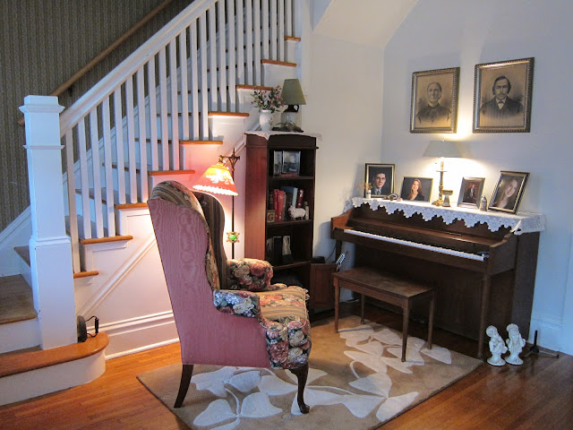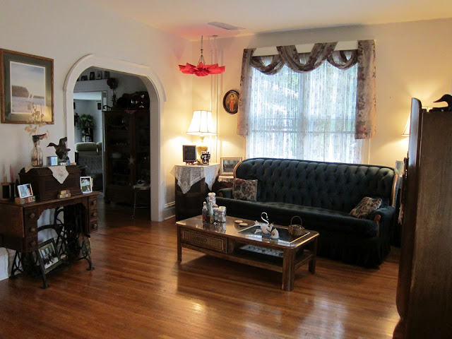 私はたいていリビングルームにいる。左の方に(ガスの)暖炉があるけど、あまり使わない。